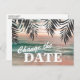 Stranddestination ändra datum vykort med en tropisk solnedgång palmstrand miljö, stränglyktor och en ny bröllopsplaner mall som är lätt att anpassa.