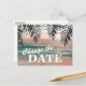 Stranddestination byta datum vykort med en tropisk solnedgång palmstrand miljö, stränglyktor, och en ny bröllopsplan mall som är lätt att anpassa.
