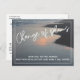 Den här designen har ett foto från en söt strand. Du kan byta ut det mot ett eget, om du så vill. På framsidan finns ett grafikhuvud som jag designat med hjälp av en handskrift av avslappnaden, som lyder "Ändring av ritningar". Nedre, det finns ett glatt meddelande som du kan redigera och som förklarar dina nyheter: "Vi är fortfarande Gifta sig! Höger nu är vi inte säkra på när det kommer att hända." Den här texten visas i vitt i mitten av två smala gräns. På baksidan finns mallplatshållare för information. Använda dessa fält att lägga till era personuppgifter och ändra mitt förslag till formulering till kostym för era behov och er situation.