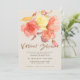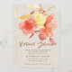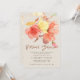 Modern botanisk virtuell möhippa- eller babyduschinbjudan med stor genomskinlig korall, damm och bränd orange och gult ljusblommor från guld och ett glitter typografiskt skript av kopparbeige som papper på ett grått-beige-kraftverk. ++++++++++++ En stor elfenbensgrädda med guld på baksidan.+++++++++++++++++++ Denna inbjudan är lämplig för snyggt sofistikerade, moderna möhippor som avstånd social.