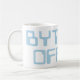 Bold geometric "BYTE OFF" made from shimmering blue hexagons on a deep black background—perfect for tech lovers, coders, and cyberstyle fans who want a sleek, modern statement tee or sticker that reads like a pixel-powered slogan.