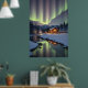 En mysigt trästuga med varma, glödande fönster sitter på en snöbank som bortser från en lindningsflod. Ovanstående himmel kan skönjas med grönt och lila av auroran borealis, vilket ger en magisk glöd på det omgivande landskapet. Träd och bergsområdena i avstånd, som är täckta av snö, bidrar till scenen med serene och picturesque.