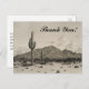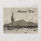 Tack för vykortsdesignen är ett ökenlandskap med accti och berg på framsidan, tillsammans med meddelandet "Tack!". Baksidan innehåller ett tackmeddelande från personligen.