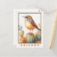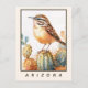 This postcard features watercolor art of a cactus wren perched on the thorny succulent. The bird artwork is framed by a dark border, and the word 'Arizona' is beneath it, indicating the small desert songbird as the state bird.