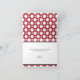 Tackkort med ett slumpmässigt prickmönster med vita cirklar i olika storlekar på en röd kaffehusinspirerad bakgrund. "Tack" är tryckt diagonalt i vitt på framsidan över en svart diagonal rand i det nedre högra hörnet. Insidan är specialtryckt med din egen text, eller kan enkelt lämnas tom för handskrivna tack. Runt detta textområde finns samma slumpmässiga prickmönster, ett unikt element till skillnad från det typiskt vita innersidor. Denna stil och färgskala gör dessa kort till ett lämpligt val för brud shower, baby shower och födelsedagar.