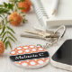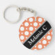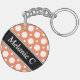 Den moderna tvåsidiga runda akryliska nyckelkedjan med en varierad polkapunkt mönster med växlande storlekar av vita cirklar över en kafe-stil-orange. Namnet eller anpassningsbarna skrivs ut diagonalt i vitt över ett diagonalt svart rand på båda sidor.