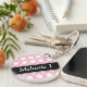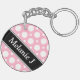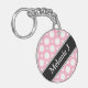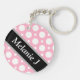 Modern tvåsidig, rund akrylisk nyckelkedja med en varierad polkapunkt mönster med växlande storlekar av vita cirklar över en kafé-stil-rosa. Namnet eller anpassningsbarna skrivs ut diagonalt i vitt över ett diagonalt svart rand på båda sidor.