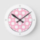 8-tums rund väggklocka designad med ett polka dots mönster med vita cirklar över en kaféh-stil-rosa och små grått-cirklar för att ange 3, 6, 9 och 12-timmarspositioner. Du kan också uppgradera till väggklockan 10,75 tum.
