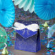 con fondo medio negro y medio azul y Decoración estilo oriental dorada en la parte de inferior y con la misma decoración homos hecho dos pájaros con el mismo estilo de la parte superior y para finalizar un toque de estrellas alrededor.