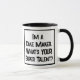 Lustigt slogan på en mugg som säger "Jag är en Cake Maker. Vad är din toppen talang?" Två Tone Mugg för en kummelmakare. Svart och vit fet text.