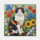 A cute calico cat standing in red poppies, blue iris and yellow sunflowers done n a pretty folk art style.