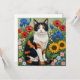 En söt kaliko-katt som står i rödpoppies, blå iris och gult solblommor som gjorts på en söt folkart stil. Cute cat pun, "ha en tass-dag."