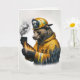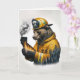 En björn som är klädd i en brandmansuniform i gult har en silhuett från Kalifornien som är uppslukad av flammor och rök och en charrad skog kommer ut från björnens jacka. Text kan ändras.