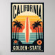 • Embrace the vibrant spirit of California with this retro-inspired travel poster showcasing a stunning beach sunset. Featuring iconic palm trees, surfboards, and the golden hues of a California sunset, this artwork captures the essence of the Golden State.