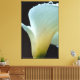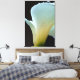Ett närfoto fångar den ömtåliga skönheten hos en calla lily. Blomens petal, en blek, halvgenomskinlig vit med subtila gulter undertoner, kurvor på ett skonsamt sätt. Bra, parallellt med linjer springa längs dess yta, som lägger till struktur och djup. Tydliga droppar från vatten som klamrar sig fast vid petalns kant och reflekterar ljus. Bakgrunden är en mörk, ett fast färg, som accentuerar blommans form och färg.