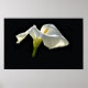En vit calla lily mot en svart bakgrund är bakgrundsbelyst med genomskinliga petaler.