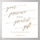 Den här kalligrafin i elegant guld är att din närvaro är vår underbarare poster gåva är perfekt för ett enkelt bröllop. Neutraltens utformning har ett minimalistiskt kort som är dekorerat med romantisk och vismisk faux-folie guld typografi. Obs! Den här designen har inte äkta guld-folie. Det är en grafik av hög kvalitet som framställs som guld-folie.