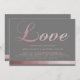 Elegant och snyggt enkel kalligrafiinbjudan med ro guld twist. Modern layout med anpassningsbarna "kärlek" i ro guld med modernt typsnitt för all information och ro guld gräns vid grund vid grått vid bakgrund av