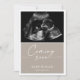 Announce the wonderful news to friends, family and loved ones about pending arrival of your precious miracle with this calligraphy chic taupe coming soon pregnancy card. The design features a classic calligraphy script that reads "coming soon", a clean white space to add your baby's ultrasound photo, name and due date.