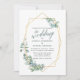 Modern Kalligrafi Skrift, Elegant Akvarell Eukalyptus Grönska, Guld Geometrisk Ram Bröllopsinbjudan Kort