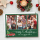 Modern Calligraphy Heart Script 3 Photo Family Photo Collage God jul Card - Watercolor Vintage Red Lastbil med Julgran - Forest Grönt Background - Forest Background