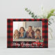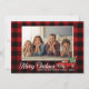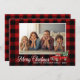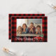 Ett vackert rustiskt stil, rödbuffel plaid - helgdag-kort med en vattenfärgad vintage röd lastbil som är laddad med träd, med kalligrafi av "God jul", namn, år eller annan text och ditt familjefoto. Anpassa ditt meddelande på baksidan av kortet för att få perfektens beröring.