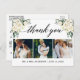 Modern kalligrafi, Elegant Watercolor White Blommigt Grey, Bröllop 3 Photo Tack Postcard omfattar vattenfärgselfenben vit ros, eukalyptus löv, botaniskt lövverk av grönt, dammiga blå löv och andra vackra botaniska grejer.
