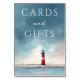This wedding tabletop sign features a serene coastal scene with a striking red and white lighthouse standing tall against a soft, pastel sky. The design combines muted blues and grays with sandy beige tones, creating a tranquil and inviting atmosphere perfect for expressing gratitude. Elegant typography in the upper portion reads "CARDS and GIFTS" followed by a heartfelt "thank you," adding a personal touch to your celebration. Ideal for conveying calmness and appreciation, this sign is a beautiful addition to any seaside-themed event.