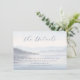 This wedding enclosure card features a serene landscape with soft, muted blues and grays, creating a calming and elegant atmosphere. The design showcases a tranquil body of water reflecting the sky, with layered mountain silhouettes in the background, enhancing depth through atmospheric perspective. Elegant script typography adds sophistication to the layout, which is balanced with ample negative space for a minimalist feel. Perfect for conveying details about your special day, this card evokes a sense of peace and anticipation, making it ideal for weddings or formal events.