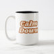 This playful coffee mug design features the bold, retro-styled phrase "Calm Down" in cream-colored bubble letters with a thick orange outline. The vintage typography gives off a cheeky, light-hearted vibe—perfect for those mornings when caffeine is the only thing keeping you from losing it.