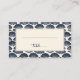 This elegant wedding place card features a nautical theme with a repeating pattern of stylized seashells in deep navy blue set against a cream background. The shells are arranged symmetrically, creating a balanced and sophisticated border around the central blank area, which is perfect for customization. The design includes an elegant cursive script for "table," adding a touch of seaside charm to your event. Ideal for coastal or maritime-themed weddings, this card exudes calmness and refinement, making it a beautiful addition to any celebration by the sea.