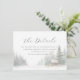 This wedding enclosure card features a serene winter landscape with a cozy wooden cabin nestled among snow-covered trees, creating a tranquil and inviting atmosphere. The design employs soft watercolor techniques with a muted palette of whites, grays, and warm browns, enhancing the dreamlike quality of the scene. Elegant script typography at the top reads "The Details," while clean sans-serif text provides information about accommodations, directing guests to a customizable website for more details. The overall mood is calm and nostalgic, perfect for setting the tone for a peaceful winter celebration.