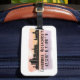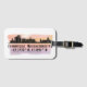 Snyggt bagagetaggen har en skyline silhouette av Cambridge Massachusetts med koordinaterna karta latitud och longitud på en stänk bakgrund av vattenfärgen.