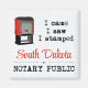 Jag kom, jag såg, jag stämplade. Annonsera din notarie i South Dakota med lite humor. Knappen med statlig stolthet ger en tankeväckande gåva till notarius professionell eller lån som undertecknar agent och som tillhandahåller juridiska tjänster till allmänheten. Den röda notarius frimärke-konstruktionen presenteras över en papper bakgrund med blått diagram.
