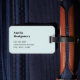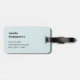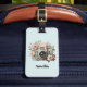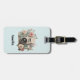 A luggage tag with a vintage styled camera decorated with flowers. Pastel colors of pink, cream and green.