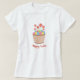 Camiseta feminina de manga curta com ilustração de cesta de vime com flores avermelhadas e ovos de páscoa coloridos. Ideal para dias mais quentes.