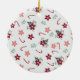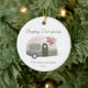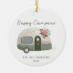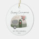 Camper Retro-julen i Grönten - prydnadsföremål har en snygg reflekamper, som alla är dekorerade för helgdagarna med ljus, vinterblommigtar, bär och strängar av ljus. Lycklig Campers befinner sig i söt, modern manustypografi och är personlig med din familj namn och år. Baksidan av prydnaden är ett samordnat blommönster under julen. Kommer också att vara tillgängligt med foto på baksidan. Ornament är en del av en samling.