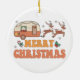 Camping God jul Reindeer Typography Ornament har texten "God jul" i en prästertypografi där en festive dekorerad karavan dras av renar och accentueras med snöflingor och holly. Designad av Evco Studio www.zazzle.com/store/evcostudio