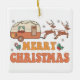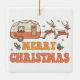 Camping God jul Reindeer Typography Ornament har texten "God jul" i en prästertypografi där en festive dekorerad karavan dras av renar och accentueras med snöflingor och holly. Designad av Evco Studio www.zazzle.com/store/evcostudio