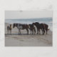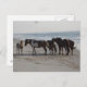 Hästar som går ner på stranden på en kylig sommarmorgon.