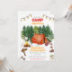 Låt äventyret börja! Fira din lilla utomhusutforskare med denna ljusa och glada inbjudan till campingfödelsedagsfest. En fräsch vit bakgrund visar frodiga tallar, ett glödande orange tält, knastrande lägereld med rostande marshmallows, lykta, vandrarstövlar, sovsäck, björnspår, en campingsköld och varma strängljus — all charm av ett riktigt läger!