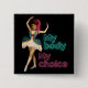Unika kvinnors höger stöder knappnålknappar med campy vintage follies dancer cutout med "min kropp mitt val" i modern neontext.