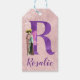 Lila glänsande versal bokstav R med fantasifull rosa bevingad feaktör kostym artist gammal fotoutskärning och anpassningsbar lila text kan användas för att lägga till ett namn eller meddelande. (Eller helt tas bort för att lämna designen som en illustrerad bokstav/monogram.) En charmig sammanställning för de som älskar campy förändrad konst på en slitna rosa bakgrund