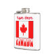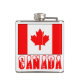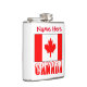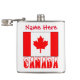 Personlig hip flask med snötäckta bokstäver som läser CANADA och finns under den kanadensiska flaggan. Lägg till ditt namn för att anpassa flaskan eller skapa en present. Den kanadensiska flaggan har en vit mitt med ett rött lönnlöv inuti. På höger och vänster sida om det vita området finns två röda ränder. Roligt att ta med till familjesammankomster, klubbar och resegrupper. Underbar present till din favoritkanadensare. Vacker att använda på Canada Day.