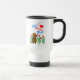 Resemugg med min design av en söt bäver som håller en skylt som säger "I hjärta Manitoba" framför några blommor.