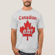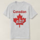 Ljusröd Maple löv med fet vit text som säger "han?" står kanadensiska. Roligtens presentidé.