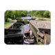 En fotografisk design av en kanal smalfågel som just har gått in i låset och väntar på att låset grind ska stängas.