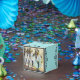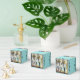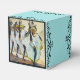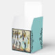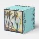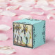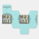 Fyrkantig, ljusblå, klassisk stil-affär med ett vackert vintage bild, på framsidan och baksidan, av fyra kankanska dansare Fransk. Svart rullningsarbete med information om sidor och överst. Se matchande favoritpåse, favärde, etikett och klistermärke. Visa hela samlingen för Cancan Favor Box i SPECIELLA TUUCHES | Avsnittet Party favors.