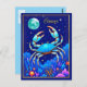 Vykort i en illustration av Cancer stjärntecknet med en stor, blå krabba med orangea accenter mot en stjärnklar natthimmel. En lysande fullmåne svävar ovanför, medan färgrik, drömlik havsflora fyller förgrunden.