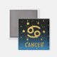 Anpassningsbar magnet för "Cancer" med gyllene zodiaksymbol och guld-stjärnor med blå och svart övertoningsbakgrund. Finns i flera storlekar.